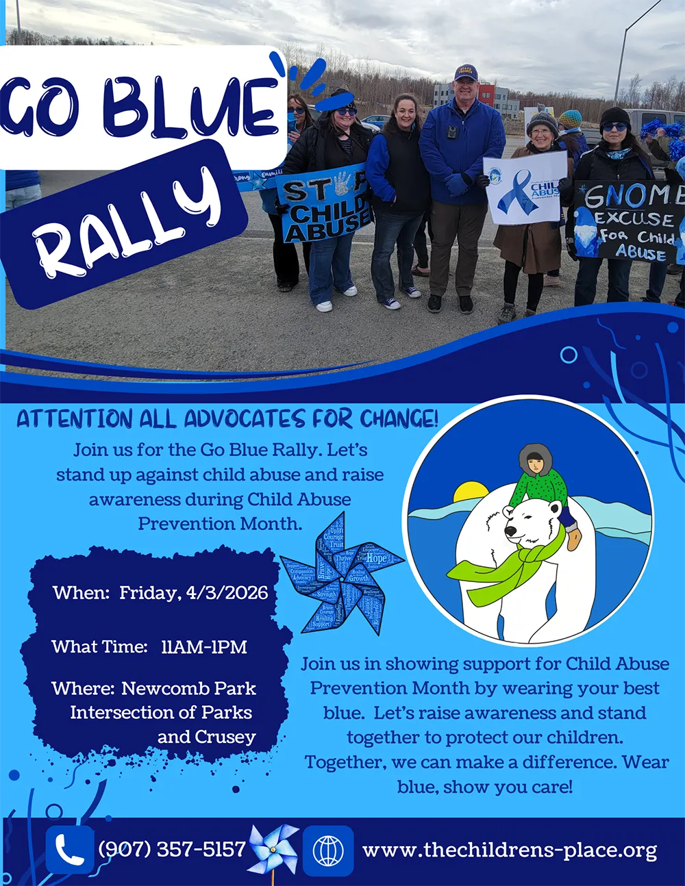 April is Child Abuse Prevention Month. The Children’s Place Go Blue Rally! Wear Blue, Bring your signs!
